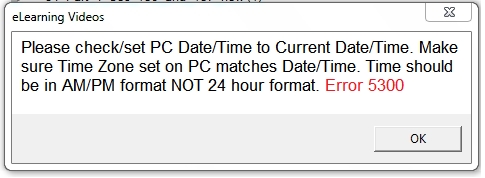 1) Please check/set PC Date/Time to Current Date/Time. Make sure Time Zone set on PC matches Date/Time. Time should be in AM/PM format NOT 24 hour format. Message 5300.