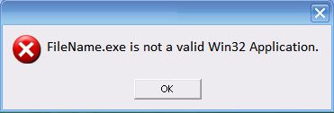 FileName.exe ( or VideoPlayer.exe ) is not a valid Win32 Application.